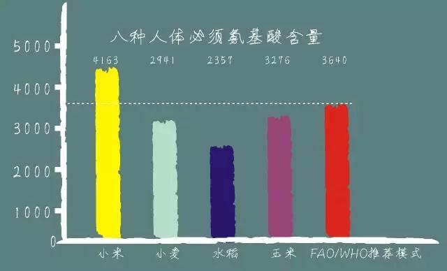 小米的氨基酸種類齊全,含有人體必需的八種氨基酸。除賴氨酸偏低外,其余均符合聯(lián)合國(guó)糧農(nóng)組織(FAO)和世界衛(wèi)生組織(WHO)所推薦的模式。