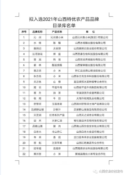 關(guān)于擬入選2021年山西特優(yōu)農(nóng)產(chǎn)品品牌目錄庫(kù)名單的公示